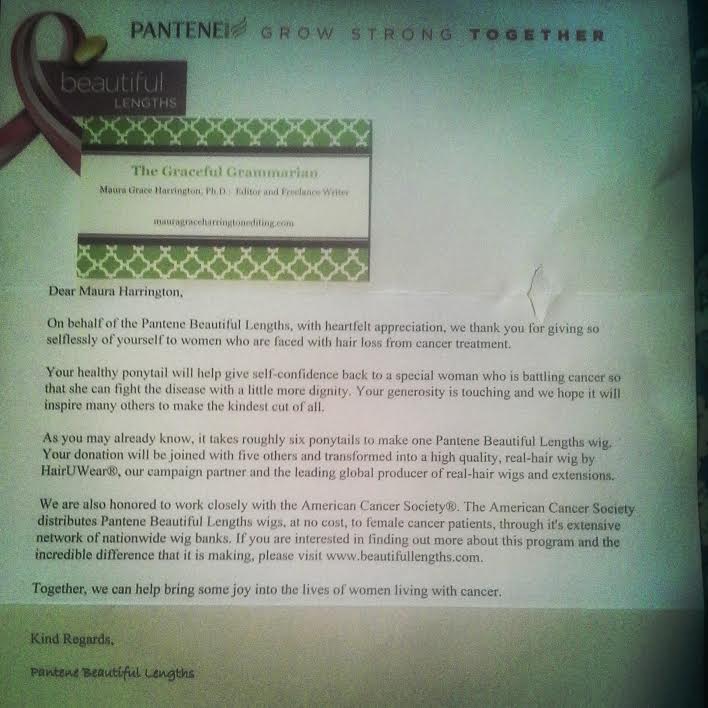 Receiving this letter today put a smile on my face. (Also, I hereby officially volunteer to edit the acknowledgement letters to Pantene Beautiful Lengths ponytail donors.)