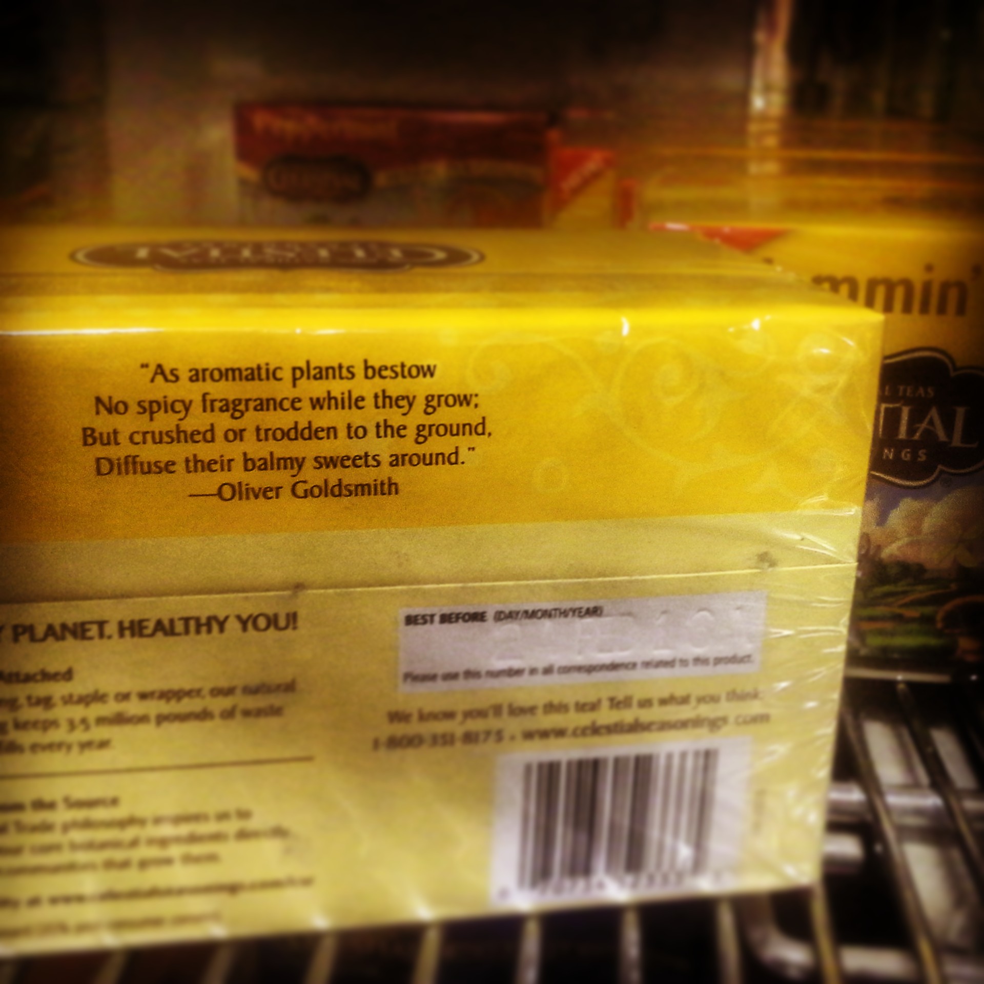 Poetry is everywhere! Proof: here’s what I found on the back of a box of Celestial Seasonings Jammin’ Lemon Ginger Herbal Tea.