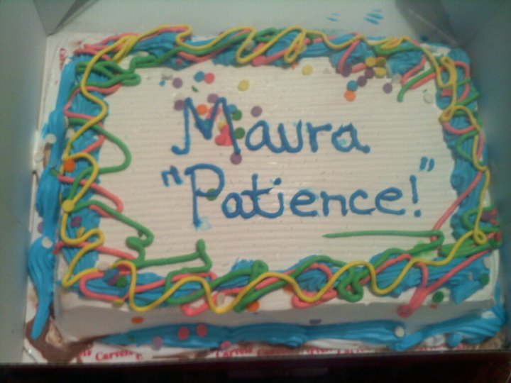 Note the message: “Maura ‘Patience!’.” Not the traditional “get well soon” with flowers and frilly wishes, not even a comical greeting designed to make me laugh. No, Fr. Bob knew exactly what I (his audience) needed. I needed to hear (and see, and taste) that patience is necessary. The medium he chose in order to convey this message was perfect. Patience has always been one of my personal challenges; Fr. Bob, knowing me so well, also knows that Carvel cake is one of my favorite things in the world, ranking right up there with Roy Rogers roast beef sandwiches. Fr. Bob could have chosen to give me a lecture on the theological virtue of patience, or he could have warned me against impatience. Instead, he conveyed his message in the medium that was best suited to my needs and tastes at the time.